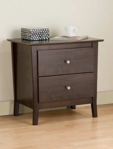 Features The Manhattan 2 Drawer Night Table in Espresso Finish from Prepac features 2 large drawers, solid wood legs, a profiled Multi-Density Fiberboard top and drawer fronts, modern brushed nickel knobs, and smooth running drawers with metal slides and safety stops. The overall dimensions of the Manhattan 2 Drawer Night Table are H 24.5 x W 25.25 x D 15.75 (inches). Assembly required.