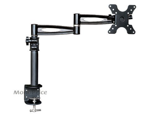 Edge clamp, desktop mount for Flat Panel Displays. This high quality, steel mount allows you to conveniently attach your monitor to the edge of your desk, maximizing your desktop work space. Variable height adjustment brings your display to the perfect viewing height, preventing undue neck strain. Folding, jointed extention arm with a 376mm (about 14 4/5")reach brings the screen closer to you when needed and swings out of the way when you don't. A durable and attractive black powder coat finish and reliable clamps to give your display a sturdy foundation.