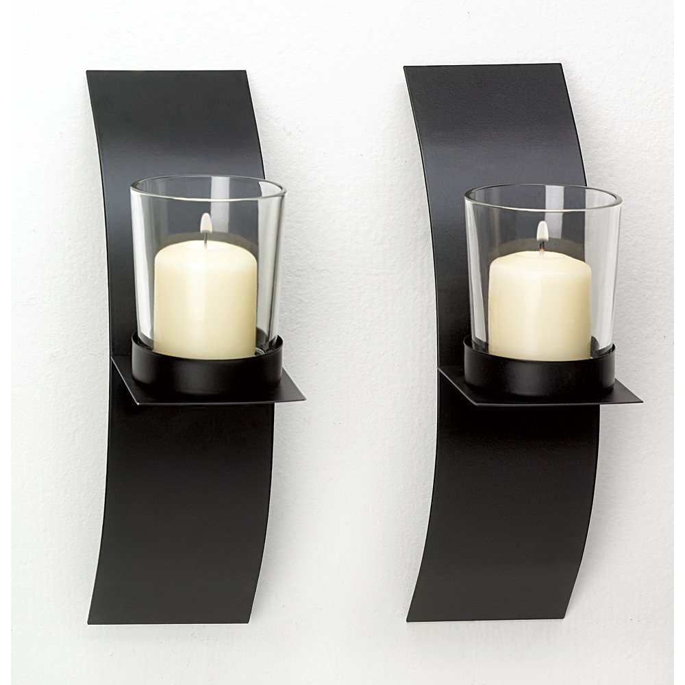 Add a chic, modernistic look to any room with this striking pair of candle sconces! Matte black finish lends drama to slender curved metal wall plaques; each supporting a clear glass votive cup. Why not add your favorite brightly-colored candles for an ultra-artistic display? Iron with glass cups. Candles not included. Each is 2 3/8" x 4 3/4" x 8" high.